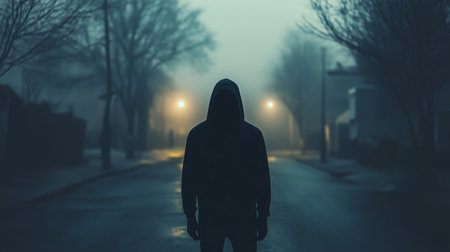 A figure stands alone in a foggy street illuminated by dim streetlights during twilight hours