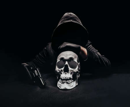 Photo of a creepy horror dark killer with revolver gun sitting with human skull on a table.