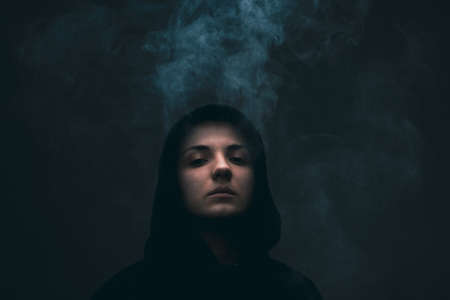 Dark portrait of a short haired girl wearing hoodie with smoke coming out of it.