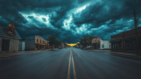 A small town street under dark storm clouds, the atmosphere tense with the impending storm