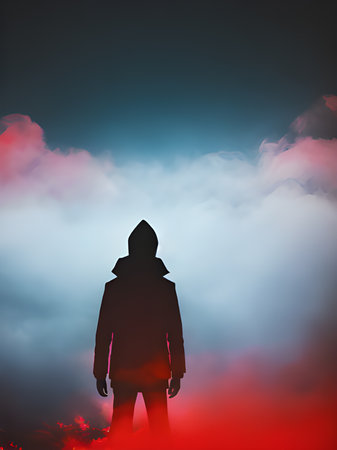 Shadowy figure of man in mist creates a haunting ambiance. Concept Mysterious Silhouette, Eerie Mood, Spooky Scene