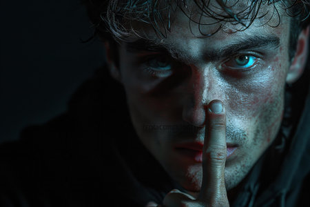 Portrait of a young man with a finger on his lips in the dark