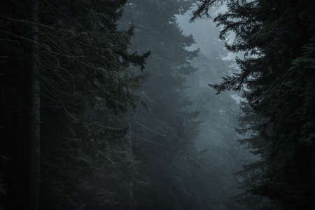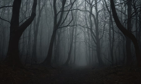 Deep dark woods on Halloween night with blue fog