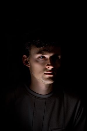 Portrait of a young man in a dark room. Black background.