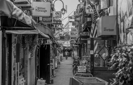 TOKYO, JAPAN - APR 15, 2019 : Omoide Yokocho, Shinjuku Bar Shop sign entrance. Japanese people walking on street Tokyo Nightlife