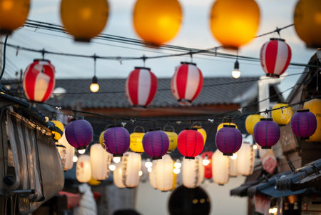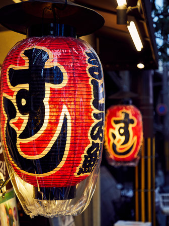 Japanese Lanterns at restaurant at Kyoto, Japan. Colorful Lanterns on street at evening