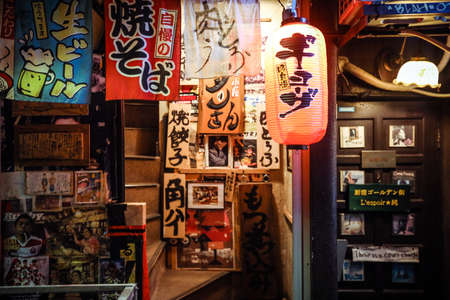 TOKYO, JAPAN - APR 24, 2019 : Restaurant Bar street Izakaya with businessman Front shop sign Japan Nightlife
