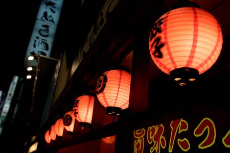Detail of bright Japanese lanterns, outside a restaurant, at night