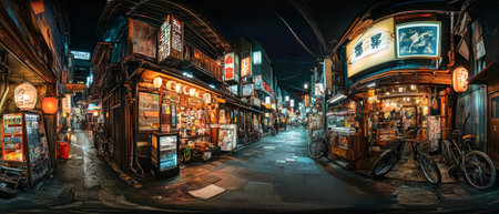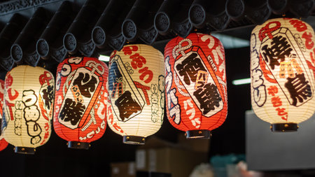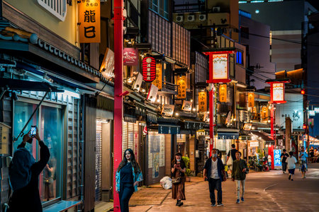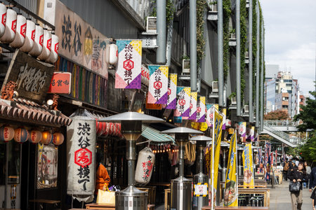 Tokyo, Japan, October 29, 2023: Traditional Japanese restaurant street with hanging lanterns