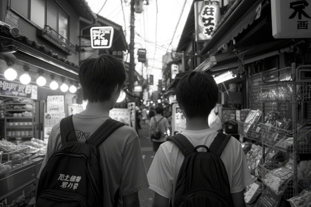 Group of positive Korean students on street portrait image, ai generated. Happy japanese friends walking together picture photorealistic photography. Urban lifestyle concept photo realistic
