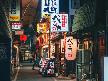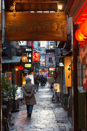 OSAKA, JAPAN - FEB 19, 2020 : Bar restaurant street in Japan. Shop closed cause of Covid19 virus