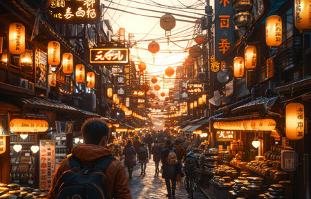 A vibrant traditional Japanese market street filled with people, illuminated by warm lanterns at sunset.