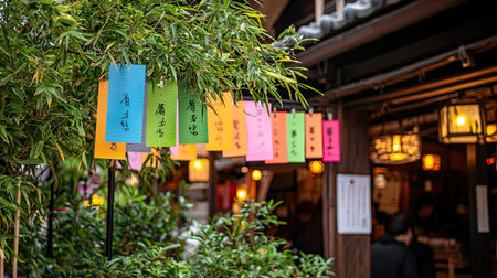 A vibrant display of colorful paper lanterns hangs amongst bamboo in a traditional Japanese street, capturing the essence of local culture and nightlife.