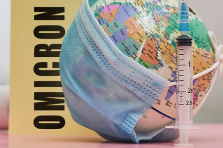 Globe in face mask and syringe. New vaccine against Omicron variant. Symbol of global roll-out new generation of vaccine against Omicron strain of virus. Omicron variant vaccine