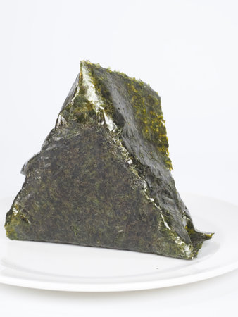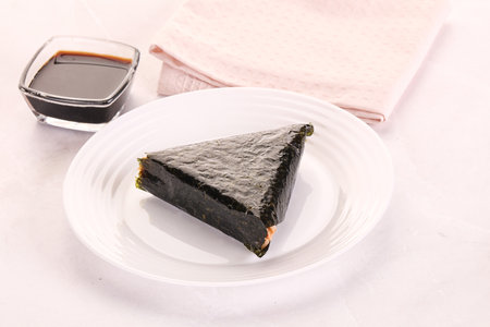 Onigiri , Japanese food rice ball made from white rice formed into triangular or cylindrical shapes. And often wrapped in nori (seaweed).