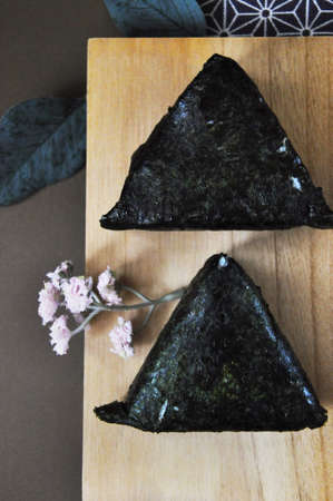 Onigiri Japanese traditional food, steamed rice in triangle shape wrap with seaweed.