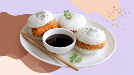 Indulge in a savory feast with this visually striking plate of fried chicken on soft rice cakes, served with a flavorful dip, perfect for culinary enthusiasts.