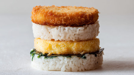 This enticing image features a stylish stack of fried ingredients layered between soft rice, showcasing culinary creativity and vibrant textures in a modern presentation.