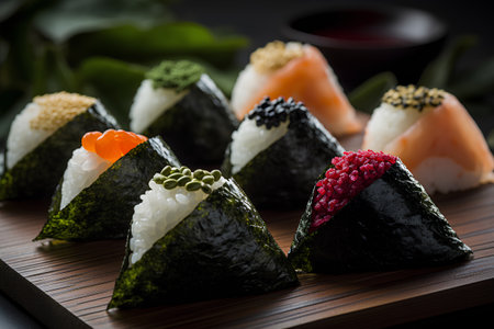 A beautifully presented plate of rice balls with colorful fillings, set against a rustic wooden background, with soft lighting bringing out the textures