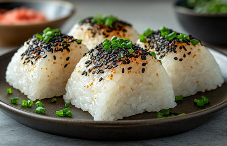 A beautifully crafted Japanese rice ball garnished with black sesame seeds, capturing the essence of traditional Asian cuisine in minimalist style.