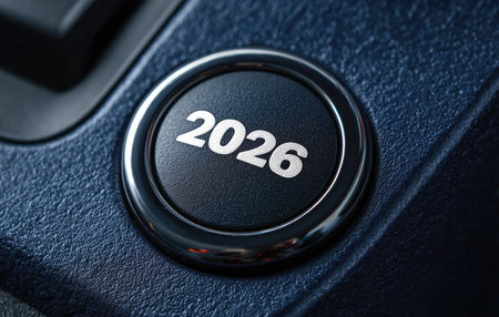A close-up shot showcases a start-stop button with a modern design. The button features a prominent, illuminated display indicating the year 2026. The composition uses contrasting colors and textures, suggesting technological advancement and future concepts. It could be suitable for articles or promotional materials.