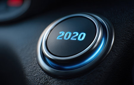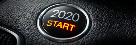 A close-up view presents a car's start button, prominently displaying the year 2020 in a bright, neon-blue font. The button, encased in a metallic ring, rests on a dark, textured surface, possibly the dashboard. The lighting suggests an indoor setting, with potential applications in design, advertising, or conceptual illustration.