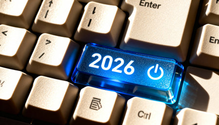 Close up of a computer keyboard with a special blue key showing the year 2026 and a power on symbol. Represents the beginning of a new technological era or year.
