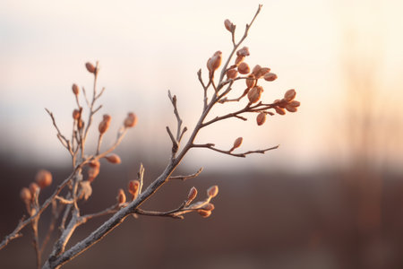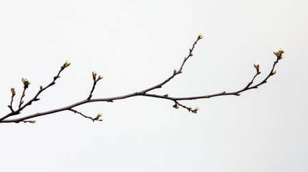 Branch with budding flowers on white background, natural minimalism concept