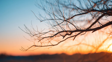 Silhouette of bare tree branches at sunset. Vintage style.