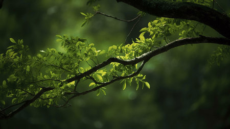 Fresh green leaves glisten in sunlight filtering through a serene forest canopy