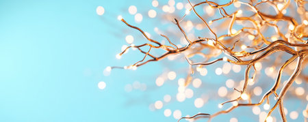 Branches of a tree without leaves decorated with Christmas balls and garlands against the night sky.