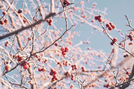 Winter picture with branches and red berries, wild apples covered with hoarfrost