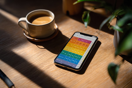 Mood tracking app shows daily progress of emotions without caffeine, next to a cup of coffee on a bright wooden table, creating a calm atmosphere.