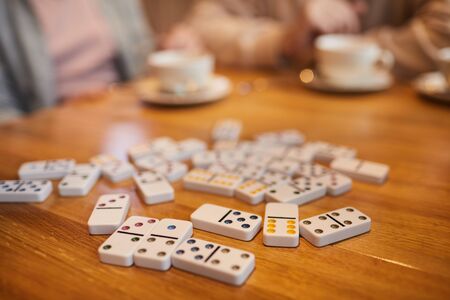 The focus is on the wood surface showing its texture with a blurred view of vintage furniture in a warm indoor space.