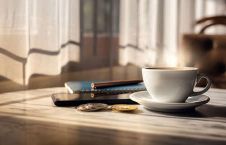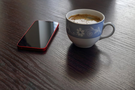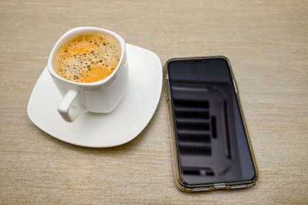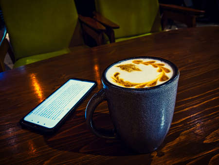 Mobile smart phone and coffee cup on cafeteria wooden table