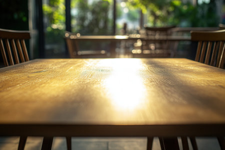 Wooden table and glass window in cafe with blur bokeh abstract background