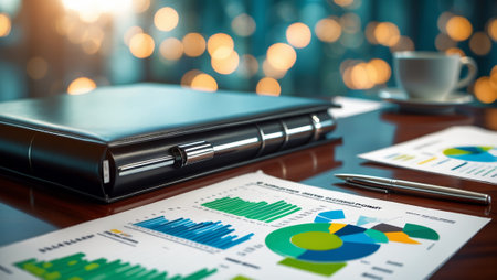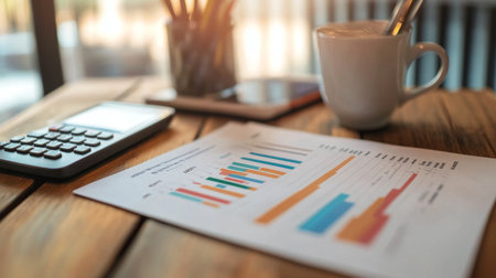 A high-resolution image of a financial report featuring colorful bar charts and graphs, placed on a desk with a calculator, notepad, and a cup of coffee.