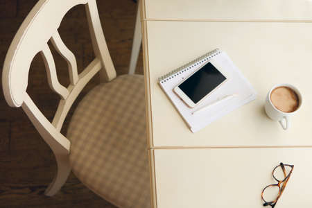 stay home - a place for home office or a place to relax. Retro style interior - cozy working place at homestylish interior in warm pastel colors, an easy chair near the table and white coffee mug with glasses.