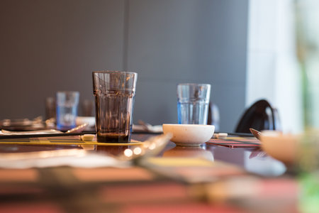 a table adorned with a white cloth showcases a striking arrangement of a blue cup and red and white plates. this contemporary quilt-inspired display, captured with the olympus mzuiko digital ed 45mm f/1.2 pro lens, exudes a rustic americana vibe. the handcrafted designs feature a fusion of light amber and red hues, reminiscent of the bold and aggressive quilting style popularized by donald judd. ai