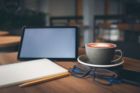 Work from home, desk office with digital tablet, blank notepad, eye glasses, mobile phone and coffee cup with heart shape of latte on wooden table