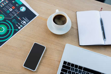 Close up of working place in office with wooden table and laptop laying ,Place of work. comfortable working place with laptop espresso smart phone notepad paper pen eyeglasses mouse laying on it