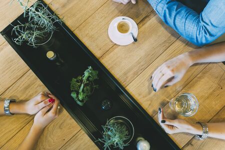 A closeup of people having a conversation at an outdoor cafe with a phone on the table