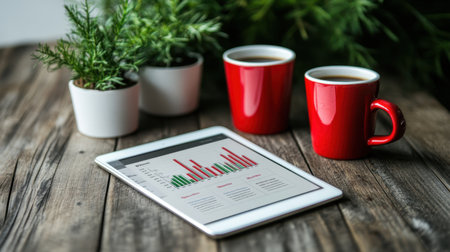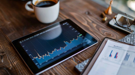 A tablet on a desk with a financial graph showing stock market trends, next to a cup of coffee and notepad.