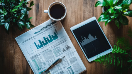 A creative flat lay of a desk with a financial newspaper, graphs on a tablet, and a cup of coffee, illustrating a busy day of financial analysis and decision-making