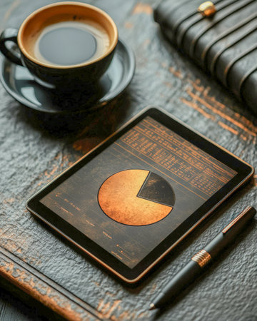 A black tablet displaying an orange pie chart next to a cup of coffee on a dark textured surface, symbolizing financial and business analytics. Minimalistic and professional