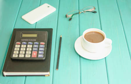 On the office table, business supplies, coffee, telephone, glasses, calculator and hourglass with a notebook