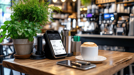 A cozy cafe workspace featuring a steaming cappuccino, smartphone, and vibrant green plant. Ideal for productivity, relaxation, and modern living aesthetics.