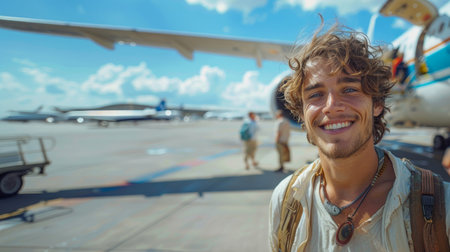 Portrait of a smiling young man standing in front of an airplane