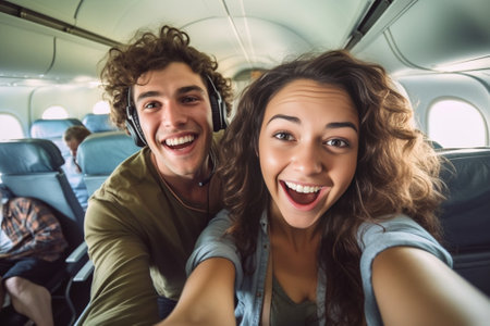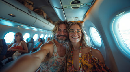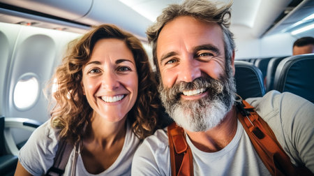 Generative AI : Happy tourist taking selfie inside airplane Cheerful couple on summer vacation Passengers boarding on plane Holidays and transportation concept