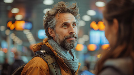 Conversation Between Two Travelers in a Crowded Airport Terminal During Late Afternoon